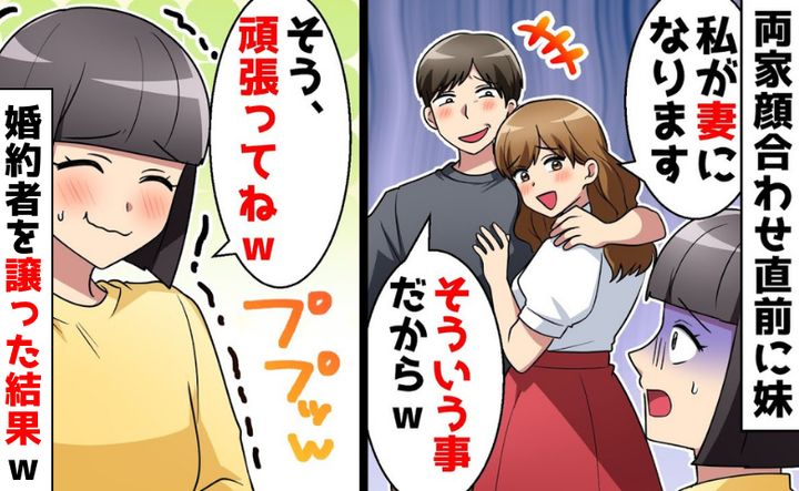 その翌日は、両家顔合わせの日。こんな気持ちで、顔合わせなんて……不安を抱えながら、両家の家族と待ち合わせをしていたお店へ出向きました。彼と一緒に少し早めにお店に到着すると、すでにお店に着いていた妹が、いきなり彼に抱きついて、彼も妹の肩を抱き寄せ、私より妹のほうがいいと言ったのです。そして、妹は「私が彼の妻になる♡」と宣言。私は言葉を失いました。