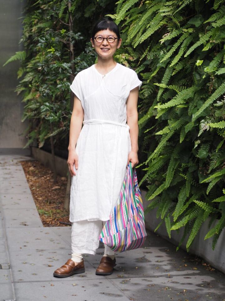 灼熱の都会で、ひときわ軽やかな空気をまとう大石さん。この日は、柔らかな風合いのリネンで仕立てた自作のワンピースに同素材のパンツをレイヤード。およそ3日かけて作ったというお気に入りの一着なのだとか。「肌への負担が少ない天然素材が好きです。夏は特にリネンの出番が増えますね」