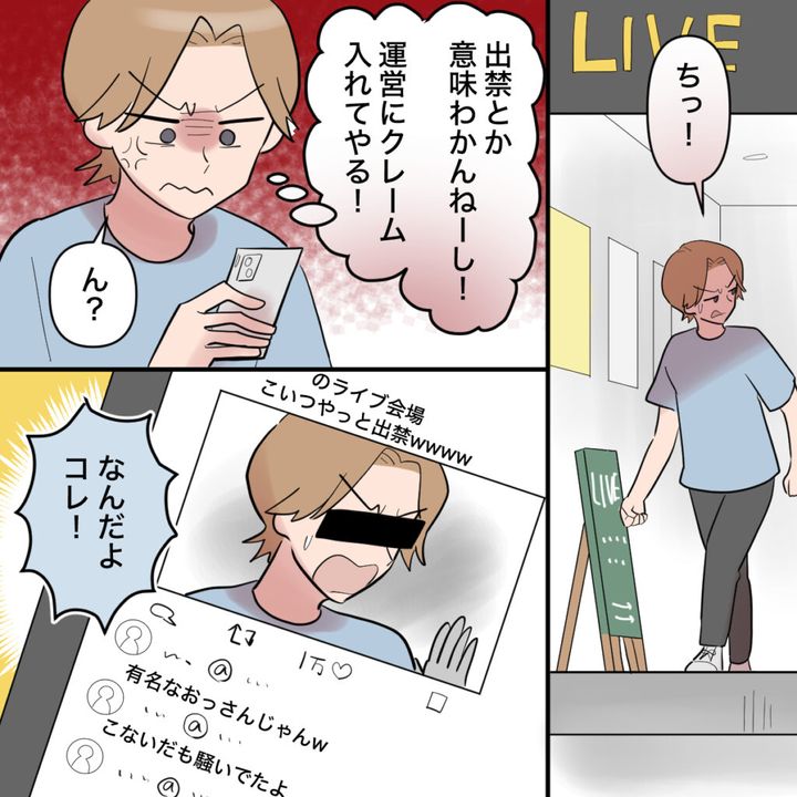 ライブ会場の外に追い出されてしまったオサムは、「ちっ!」と舌打ちしながら、「出禁とか意味わかんねーし!運営にクレーム入れてやる!」とスマホを見ると、「@ライブ会場 こいつやっと出禁wwwww」「有名なおっさんじゃんw」「こないだも騒いでたよ」と自分がSNSで叩かれているのを見て、「なんだよコレ!」と叫びました。