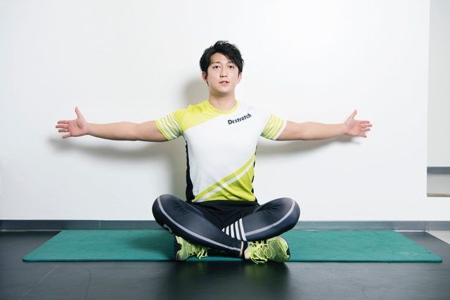 (1)座った状態で背筋を伸ばして両腕を肩の高さまで上げ、肩甲骨を寄せるイメージで左右に開く