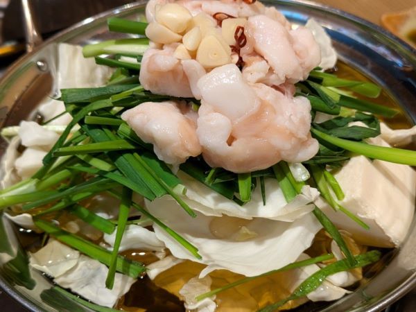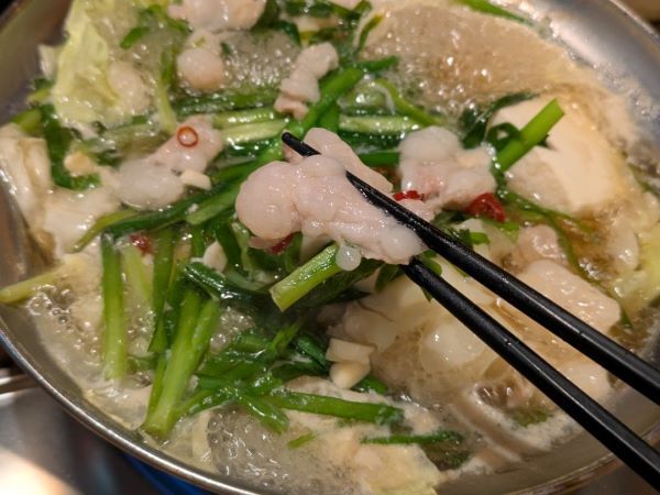 食べごろになると、湯気に包まれた香りが食欲をそそります。スープを味わうと、その香りの正体が「あごだし」であることが分かりました。もつ肉に魚介系のだしが合わさったハイブリッドなスープの味わいは、まるでもつ鍋専門店のようです。お酒は勿論、ご飯にもうどんにも合いそうな、日本人がきっと好きな味!