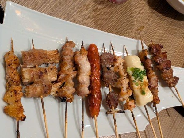 今どき珍しく、鶏肉を1本1本丁寧に手打ちして焼いているそうです。盛り付けも扇のように美しい!日によって変わる盛り合わせは、この日は「肝」「豚バラ」「ささみ」「砂ずり」「皮」「ウインナー」などでした。