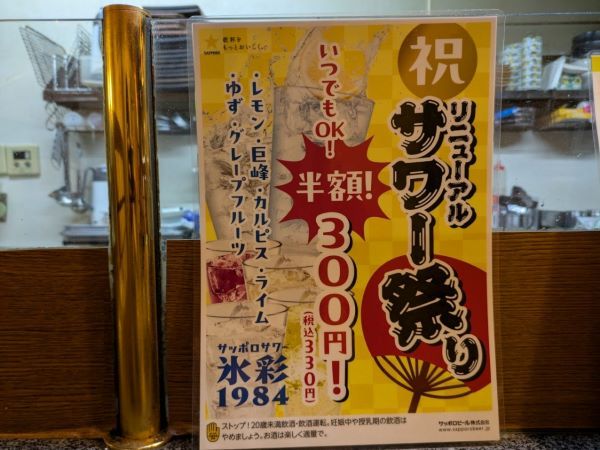 今回はリニューアルしたばかりの「サワー」(各330円)をいただきました。只今半額とお得なのですが、(8月いっぱいは半額でその後は未定)、この価格は開店からラストオーダーまでいつでも同じ価格だそうですから、嬉しい限りです。