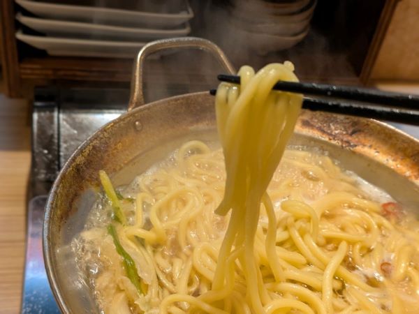 しめは、「めん」か「雑炊」が選べます。今回はお勧めの「めん」(250円)をグツグツ煮込んでいただきます。絶品スープがしみ込んだ「ちゃんぽん麺」入りの鍋を、最後の1本1滴までおいしくいただきました。