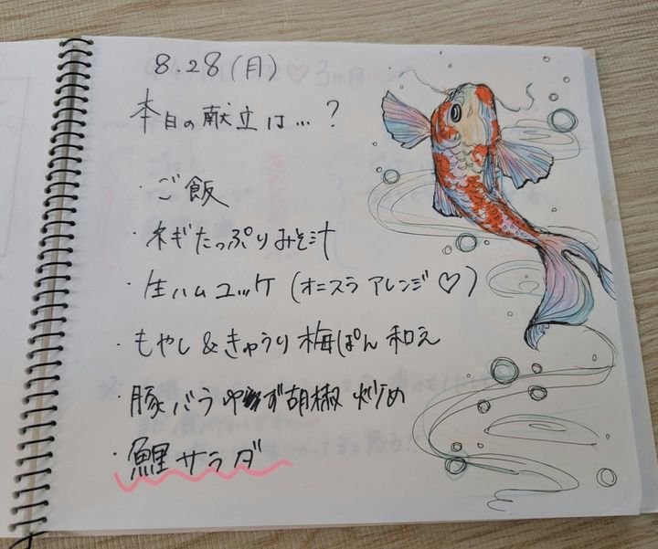 付き合いたての初々しいころ、ここ☺︎🦈ここまるさんは毎日手書きで夕飯のメニューを書いていたというから驚きです。話題になったのは、その献立の中に登場するメニュー、「鯉サラダ」です。ポテサラの上に海苔を散らばせてから生ハムで包んだというメニューですが、画像を見ると素敵過ぎるアイデアです。半同棲時代の日常の小さな記録が、時を経て大切な思い出としてよみがえるなんて、とても感動的です。
