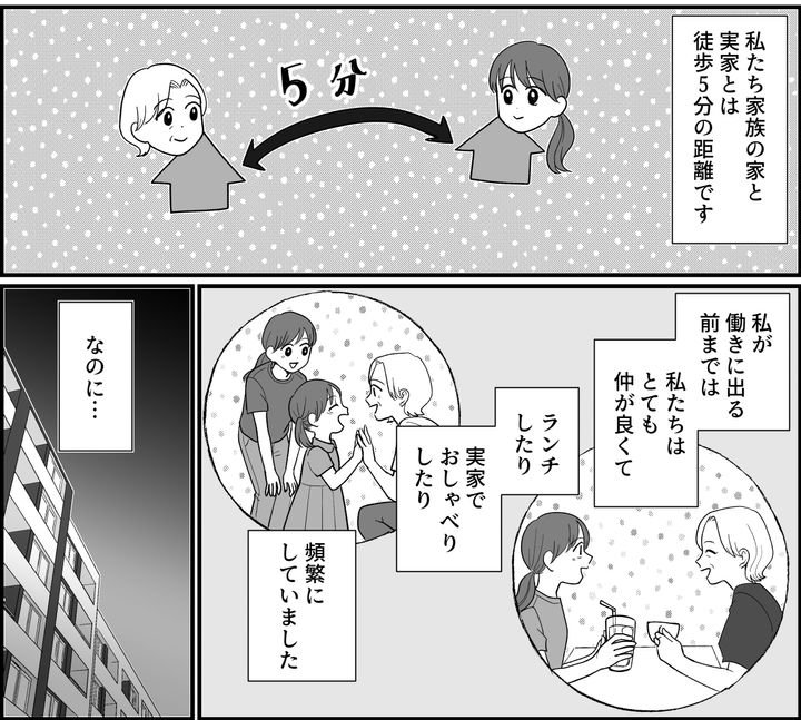 私はスズ(29歳)。実家から徒歩5分の所に旦那のマサル(32歳)とユキ(4歳)と住んでいます。幼いころから父は仕事が忙しくあまり家にいなかったので、専業主婦の母と2人でいることが多かったのです。ユキが生まれてからも週に何度も実家に遊びに行って、ランチに一緒に行くことも。口に出したことはありませんが、いずれかは同居するのかなとも思っていたものです。このまま仲よく過ごせると信じて疑っていませんでしたが、少しずつ、私と母の関係が崩れていったのです。
