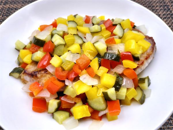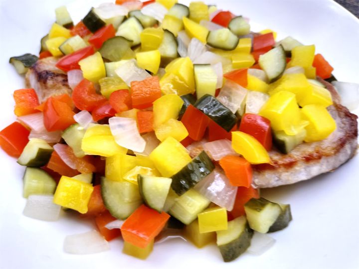 普段は冷たいピクルスしか食べないので、温かくて軽やかな酸味が新鮮。でも、シンプルに焼いた豚肉とものすごく合うことに驚きます。ピクルスの量が多すぎるかも?と思いましたが、むしろ少ないと物足りなく感じるので、多めにのせるのが断然おすすめです。