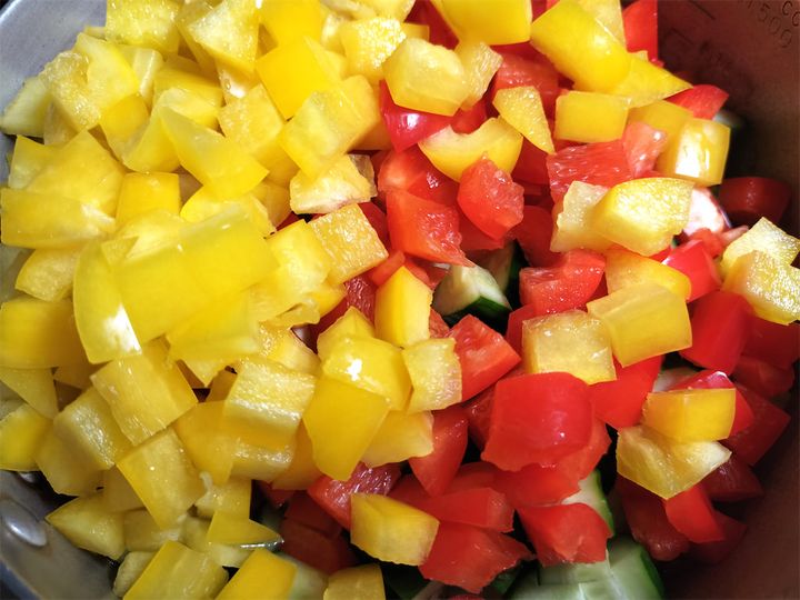 パプリカはヘタと種を取ってから、5mm程度に切っておきます。