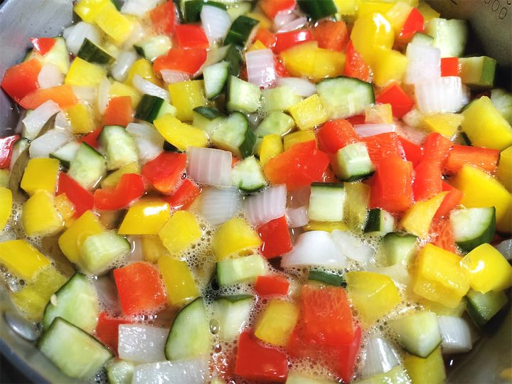 2. 沸いたらきゅうり、玉ねぎ、パプリカを加えます。