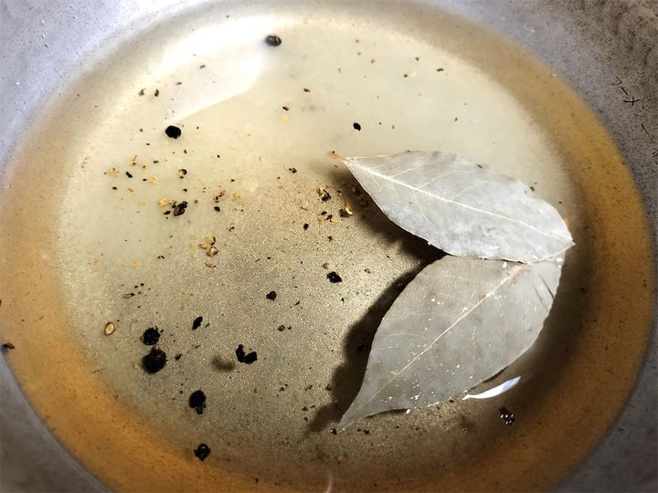 1. 鍋に白ワイン、リンゴ酢、水、塩、砂糖、黒こしょう、タイム(あれば)、ローリエを入れて中火にかけます。