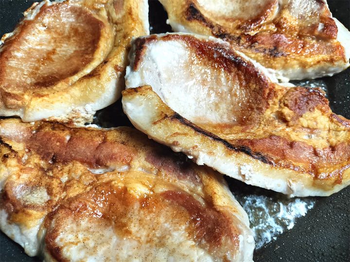 4. フライパンにオリーブオイルをひいて強火にかけ、豚肉を並べて焼きます。