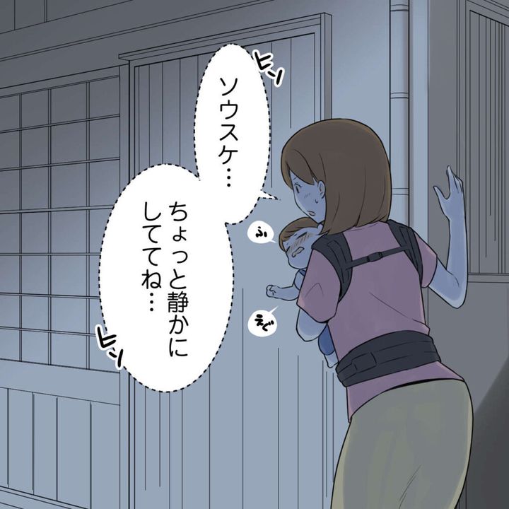 盆踊りを見に行くと、山本さんとお義母さんの姿が。なんだかんだと仲良さそうな2人を見た後、ユカたちの盆踊りを見ることに。「楽しそうだなぁ」と思っていると、お腹が空いたのかソウスケが突然泣き出したので、夫にユカたちを託して走って家に帰りました。そして家に到着すると、なんと玄関の扉が開いていたのです・・!