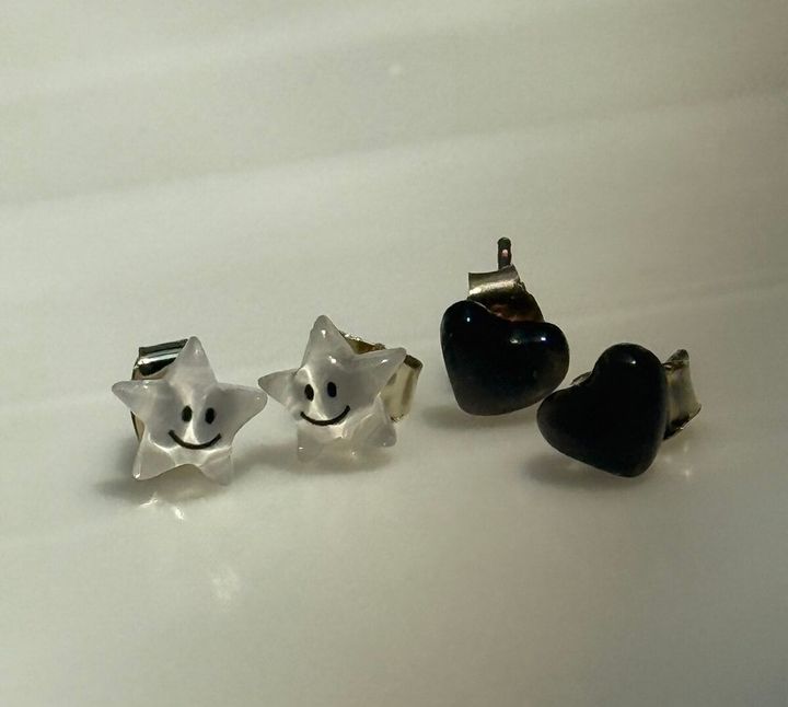 「小ぶりのピアスにハマっていて、こちらも同じくnyu nyuで購入。コロンとしたフォルムのハートピアスは、ブラックなので子供っぽくなりすぎず、コーデにさりげなく可愛さをプラスしてくれるのがお気に入りポイント。スマイルのスターピアスは、クリア素材が夏らしく、モノトーンコーデが多い私にとって合わせやすいアイテム。にっこりマークを見るだけで、癒されます♡ 各3000〜4000ウォンくらいでした」
