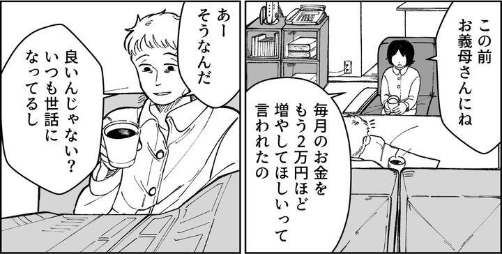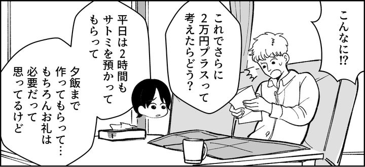 私はミカ。わが家は共働きです。夫のマサユキの帰宅はいつも22時すぎ。私もフルタイム正社員で19時になります。そのため平日は義実家が娘サトミの面倒を見てくれていました。すると先日義母が「毎月のお礼のお金を2万円上乗せしてほしい」と打診してきたのです。義実家には電気にガスに水道代、スマホ料金や固定資産税など、わが家が年間100万は支払っています。先輩のミナミさんからは、まずその費用負担を夫と話し合って明確にすべきだと言われました。