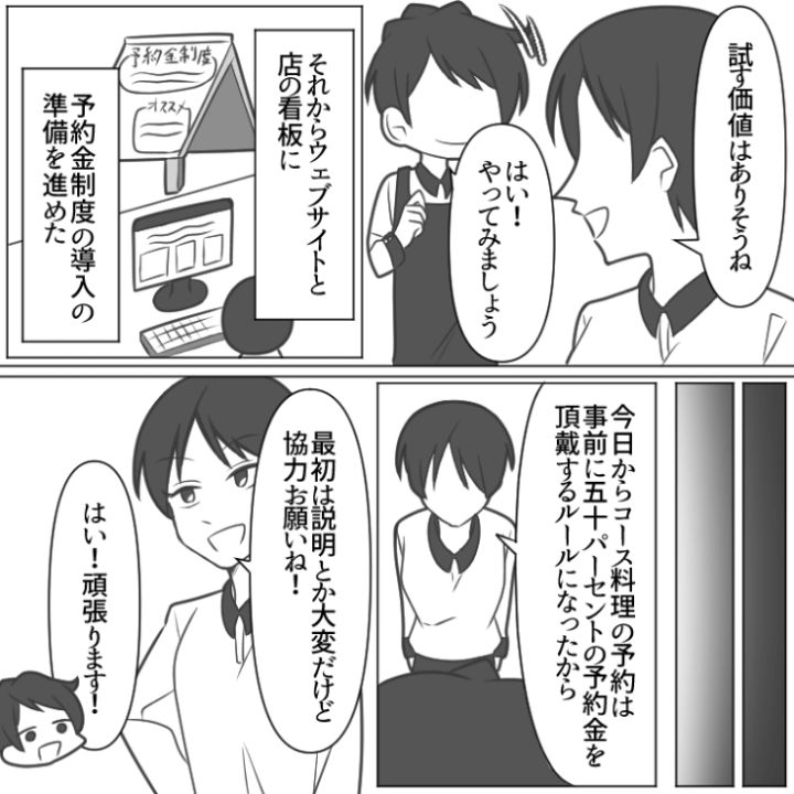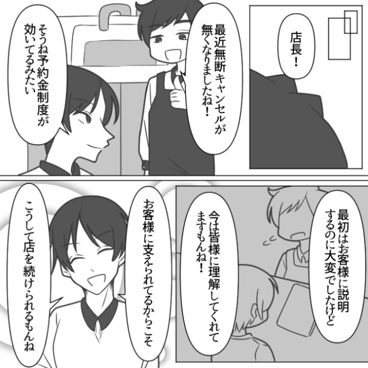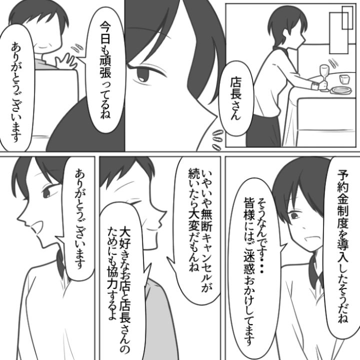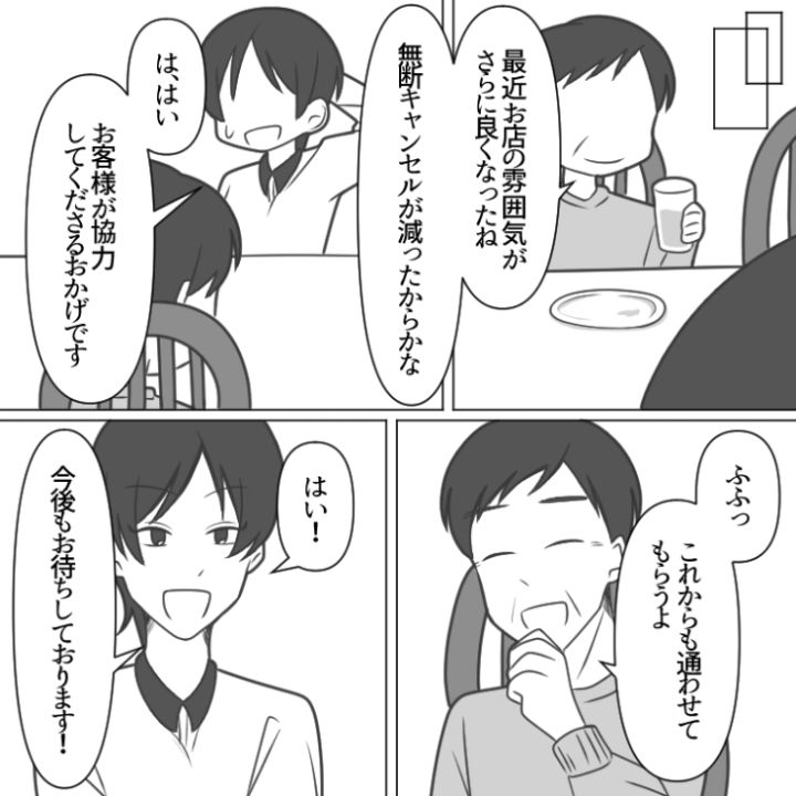 予約金という制度を導入したことで迷惑なイタズラを撃退することができた主人公。常連さんにも最近お店の雰囲気がますます良くなったと褒められ一件落着です。