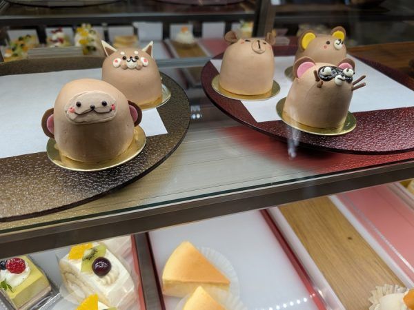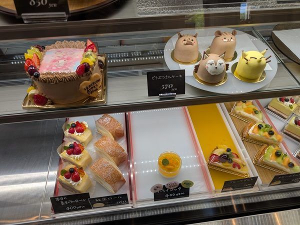 「どうぶつさんケーキ」(570円) オオカミやいのしし、きつねなどのケーキがショーケースの中に鎮座。 他にもさるやカピバラも…