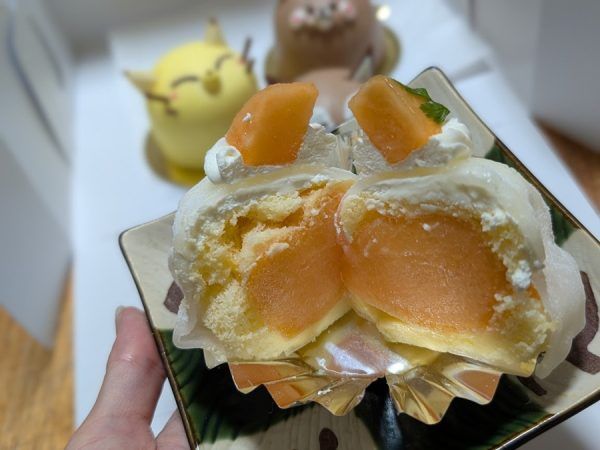 求肥の中にゴロっとしたメロン。 メロンの果汁がスポンジに染みてメロンをたっぷり味わえる大福。 甘いメロンがしっかりと楽しめる旬スイーツです。