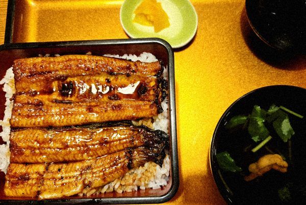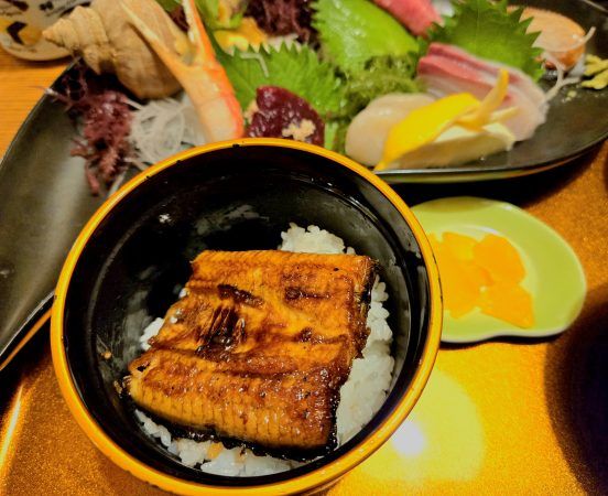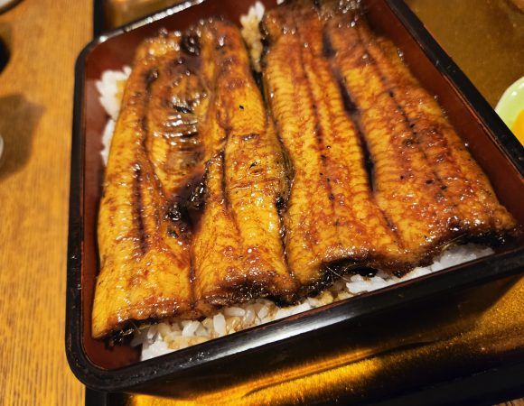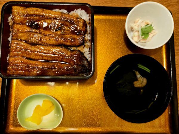 夫が頼んだのは「国産うな重(竹)」2,750円 大きなうなぎがお重にビッシリ! お吸い物とお新香付きです。
