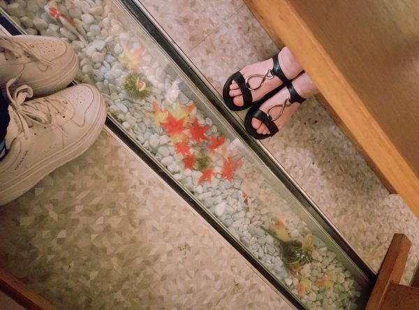 夫が「足元を見てみて~」と言うので下を見たら...。 床にとても素敵な装飾が施されていました。 夫に言われなければ気付かなかったと思います。 お店の粋な計らいに感動しました。