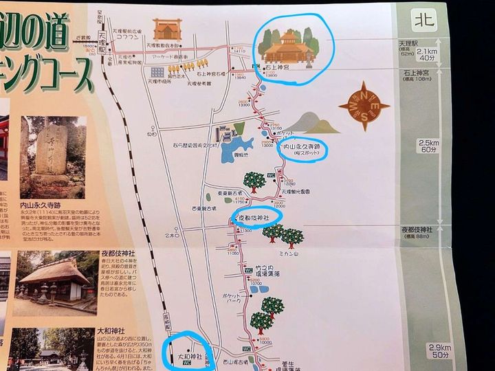 その先には、桜のスポットである「内山永久寺跡」があり、石上神宮から2.5km先には春日大社の4神を祀る「夜都伎(やとぎ)神社」も見どころ。