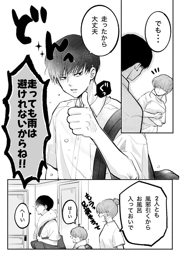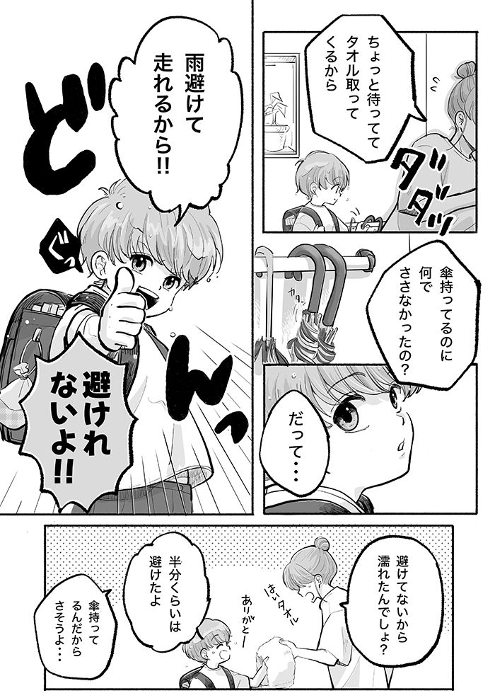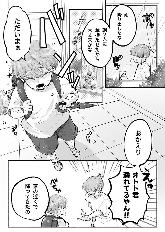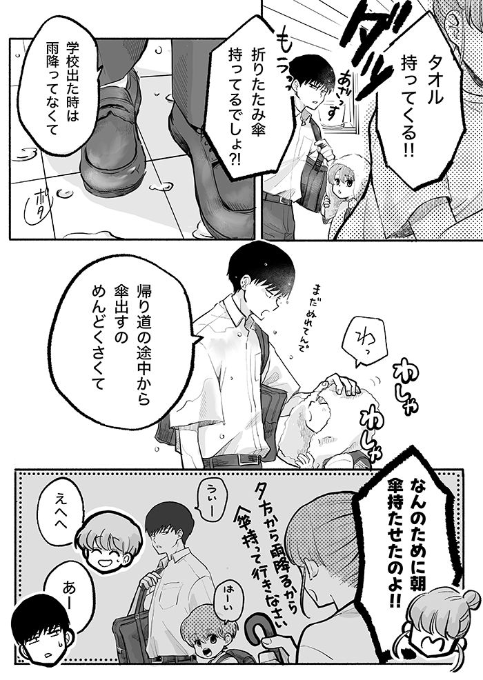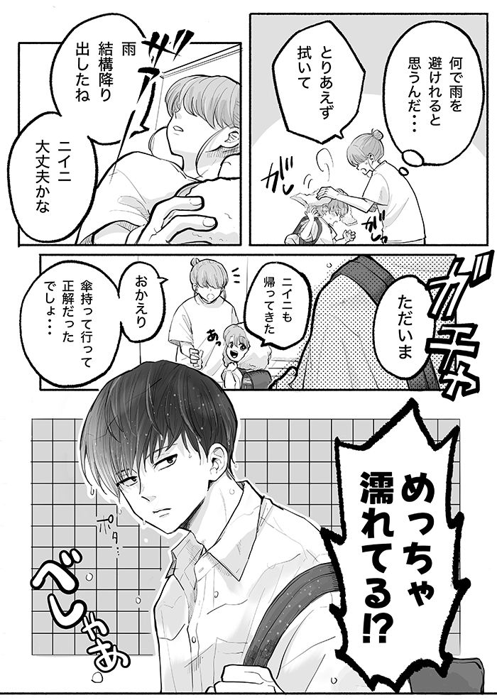 3. 「めっちゃ濡れてる!?」朝、傘を持たせたのに濡れて帰ってくるニイニとオトト君。何で雨を避けられると思うんだ!?【ぼくのニイニは高校生・43】