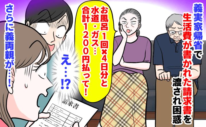 「お風呂4日分と光熱費=計1200円!」義実家帰省で生活費の請求が。夫婦で絶句!さらに義両親が…!?