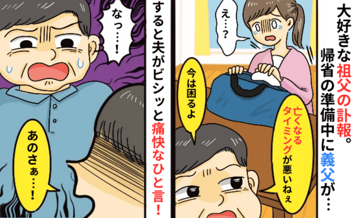 祖父の悲報を受け、帰省の準備をする私に「タイミングが悪い」義父の無神経な発言。すると夫が義父に!?