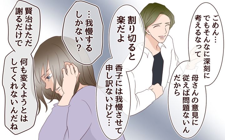 出産後、義母が今までよりも高圧的な態度で香子に当たるようになり、精神的に追い詰められていきます…。香子はどうする?夫婦で分かり合える日は来るのでしょうか…?!