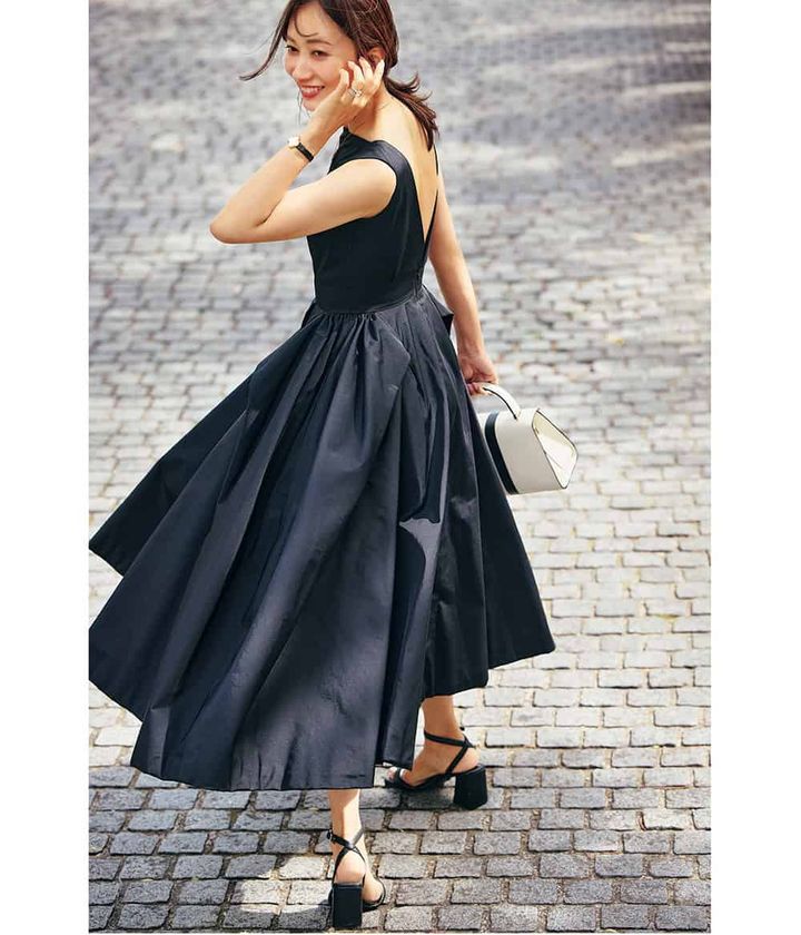 大胆な背中開きワンピもm上質な生地&モノトーン配色を選べば品良く仕上がります。小ぶりの白バッグや華奢サンダルをアクセントに入れ、エレガントに仕上げて。