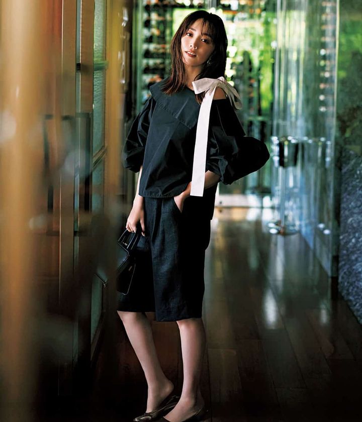 肩出しトップスはモノトーン配色で大人の落ち着きを醸し出して。ショルダーのリボンは、甘さと華やかさのアクセントだけでなく、露出感のセーブも担ってくれます。旬なハーフパンツで今っぽく落とし込んで。