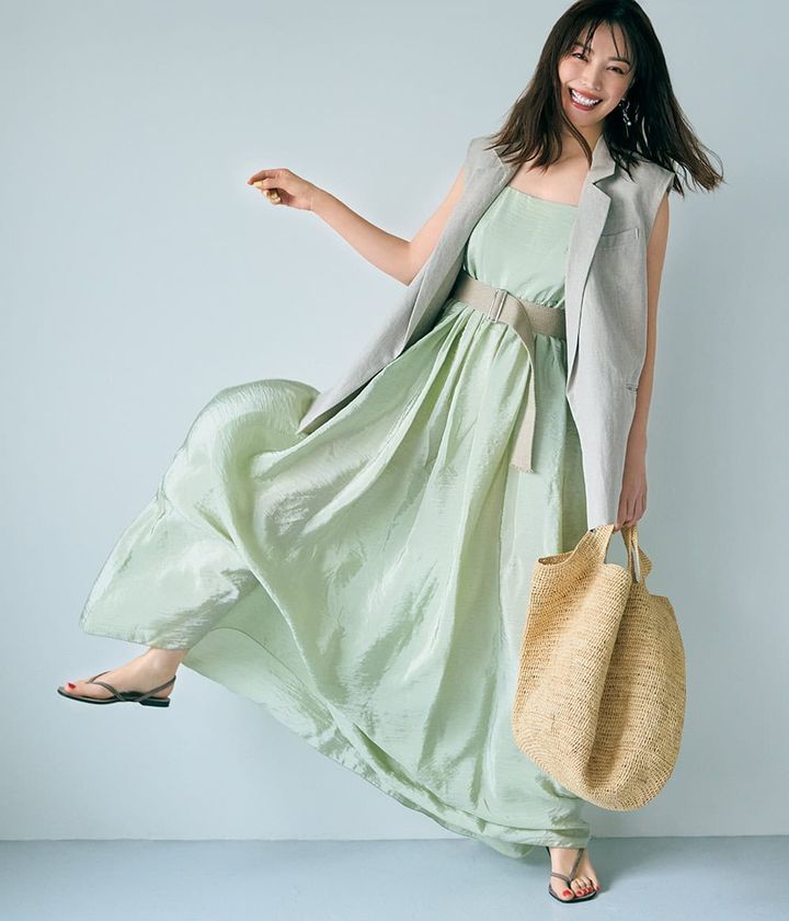 光沢のある生地感×ミントグリーンのドレッシーなワンピースには、ジレを羽織って二の腕を程よくカバー。ベルトでウエストマークすれば、今っぽさとスタイルアップを両立できます。