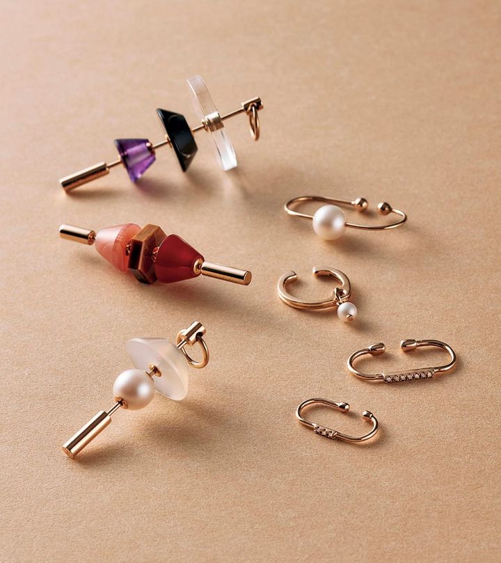 右上から時計回りに:パールイヤーカフ[K10YG×アコヤパール]¥50,600、パールイヤーカフ[K10YG×アコヤパール]¥63,800、イヤーカフ[K10YG×DIA]¥57,200、イヤーカフ[K10YG×DIA]¥38,500、ピアス※全てのパーツが単品売り[K10YG×アコヤパール×ホワイトカルセドニー]¥106,700、ピアス※全てのパーツが単品売り[K10YG×ピンクアゲート×タイガーアイ×カーネリアン]¥117,700、ピアス※全てのパーツが単品売り[K10YG×アメシスト×オニキス×クォーツ]¥134,200 (全てヒロタカ/ヒロタカ 表参道ヒルズ)