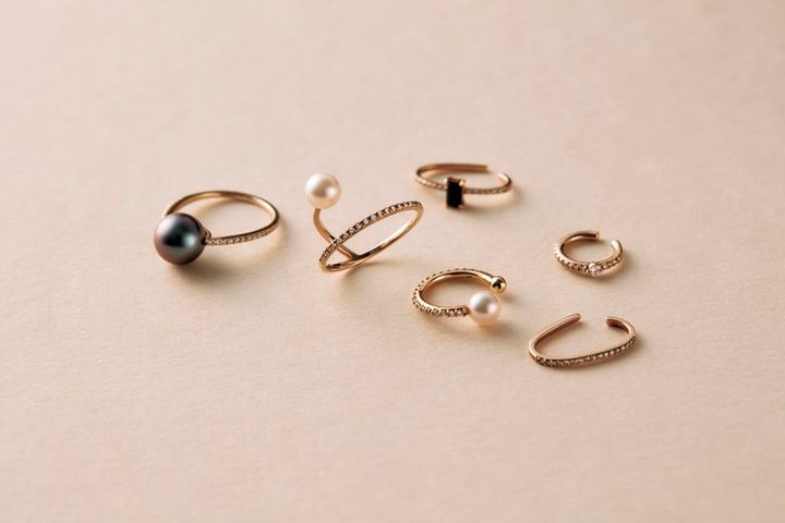 左から:ブラックパールリング[K18×DIA×ブラックパール]¥148,500、パールリング[K18×DIA×パール]¥162,800、ブラックオニキスイヤーカフ[K18×DIA×ブラックオニキス]¥95,700、パールイヤーカフ[K18×DIA×パール]¥124,300、一粒ダイヤイヤーカフ[K18×DIA]¥88,000、パヴェダイヤイヤーカフ[K18×DIA]¥88,000(全てプライマル)