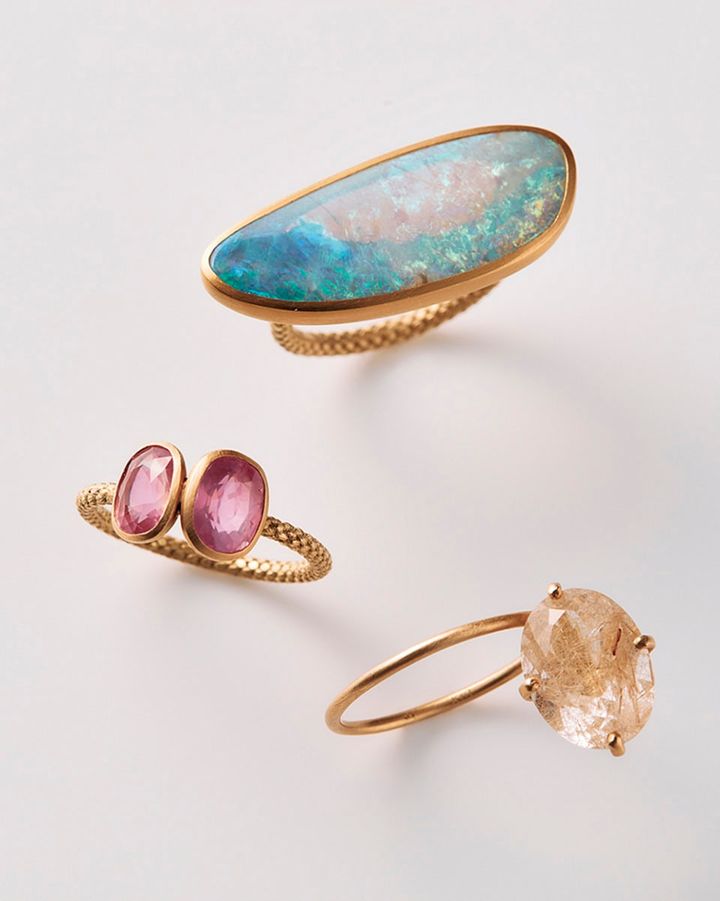 上から:リング[K22YG×K18YG×ピクチャーボルダーオパール]¥484,000、リング[K18YG×ピンクスピネル]¥308,000、リング[K18YG×ルチルクォーツ]¥148,500(全てトーカティブ/トーカティブ 表参道)