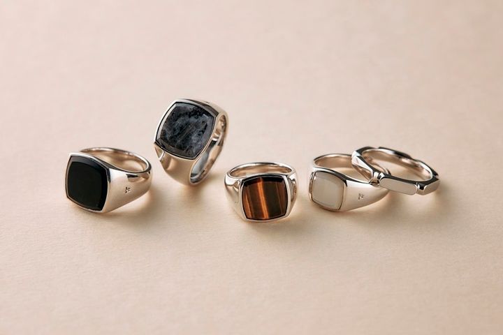 左から:リング[SV×ブラックオニキス]¥69,300、リング[SV×ラルビカイト]¥69,300、リング[SV×タイガーアイ]¥66,000、リング[SV×マザーオブパール]¥48,900、リング[SV]¥39,900(全てトムウッド/トムウッド 青山店)