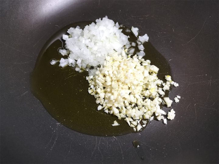 1. フライパンを中火の強にかけてオリーブオイル、玉ねぎ、にんにくを入れ、色がつかないように炒めます。
