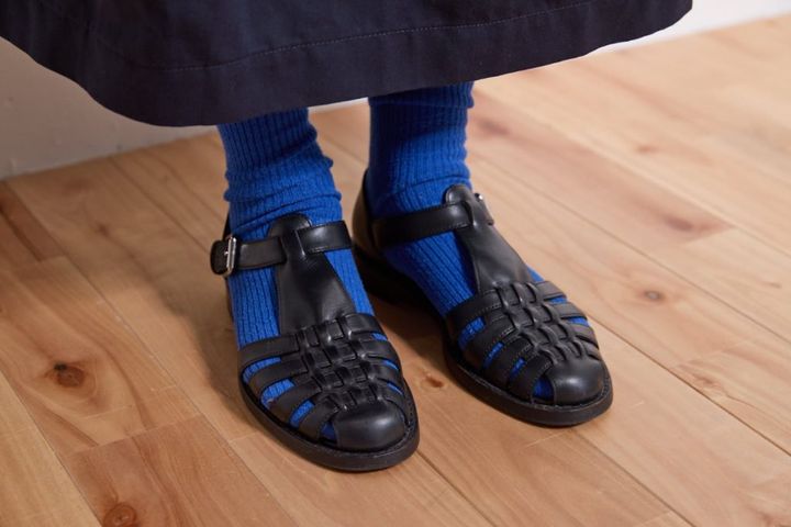 クラシカルできれいめなチャーチのサンダルに、鮮やかなブルーのソックスを合わせた印象的な足もと。