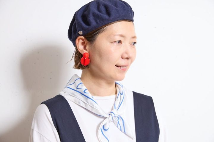 「シンプルな装いに小物を効かせるのが好きです。ネイビーのベレー帽、白地のスカーフ、赤のピアスでトリコロールにまとめ、遊び心を加えました」