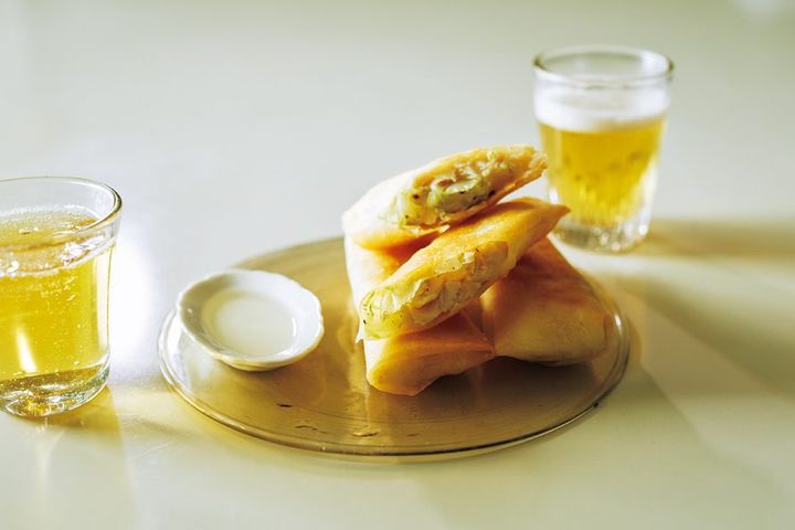 セロリと生姜がふわっと香るパンチが効いた春巻きは、ビールにぴったり。味つけは塩だけ。