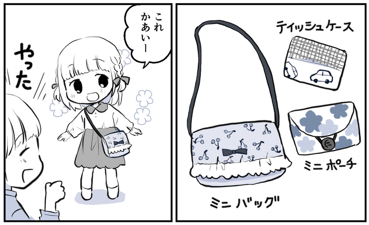 私はさっそくミシンを持ち出して、服の可愛らしい部分を使って小物を作りました。娘も小物を気に入ってくれたようです。