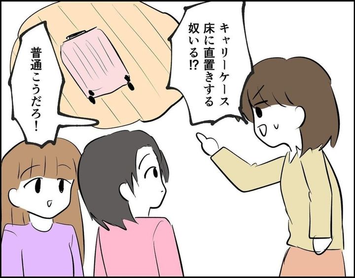 キャリーを床に直置き、ベッドの上の机…自分の家で自分自身がやることならいいのかもしれませんが、他の人の家で無断でやることではないのではないでしょうか。こうしたところの気遣いができなくなると、いくら仲が良くても「あれ?」が積もり積もる気がしますね。
