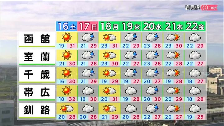 日曜日は道南で一時雨が降るでしょう。月曜日は夏空が広がり30℃前後まで上がります。来週も日中は蒸し暑い日がありますが、朝晩はしのぎやすい季節に移り替わります。