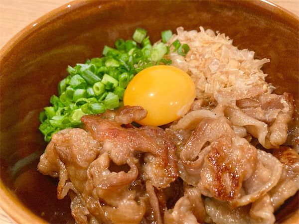 8. 器にうどんを盛り、豚肉(たれごと)、かつお節、青ねぎ、卵黄をトッピング。最後につゆをかければ完成です!