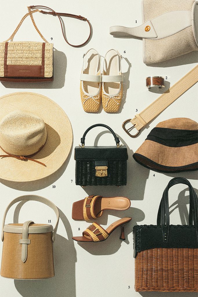 季節感を添えたいとき、軽やかさやちょっとした遊び心が欲しいとき。あらゆるタイミングに、ラフィアやラタンなどの天然素材でできた小物が便利。 ※( )内の数字は、バッグは縦×横×マチ、ストールは縦×横、靴はヒールの高さで、単位はcmです(編集部調べ)。