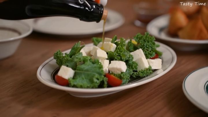 ケールやトマトといっしょに器へ盛り、オリーブオイルをかけたら、おしゃれなサラダの完成です。パニールは弾力のある木綿豆腐のような食感で、モッツァレラチーズのようにクセがないそう。チーズはちょっぴり苦手も…という方や子どもでも挑戦しやすいでしょう。