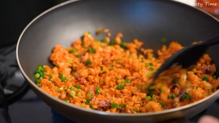 Tasty Timeさんは、タコチャンジャを炒飯の味つけに使用。卵を混ぜたごはんをごま油で炒め、お好みの量のタコチャンジャを混ぜます。チャンジャ自体にしっかりと味があるので、味つけに悩まなくてもおいしい炒飯ができ上がりますよ。仕上げに少量の醤油とネギを加え、軽く炒めたら完成です。