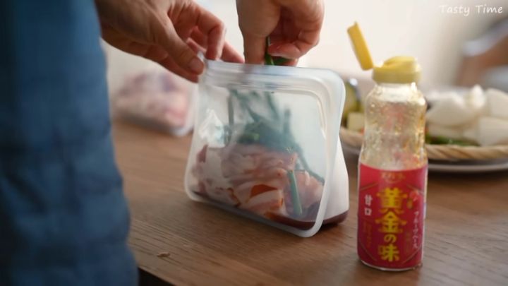 巻いて冷凍しなかった分は、下味をつけて冷凍する用に。今回Tasty Timeさんが作ったのは、焼肉のタレ漬け・煮物・味噌炒めの三種類。豚バラと野菜を味つけして、チャックつきの保存袋に入れて冷凍します。