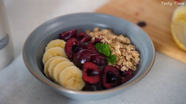 アサイーボウルのもったり感を出すため、冷凍ピューレの他に冷凍バナナや牛乳もいっしょにミキサーへイン!できあがったスムージーを器に盛り、お好みのフルーツやグラノーラなどを添えたら、栄養満点&おいしいアサイーボウルの完成です。