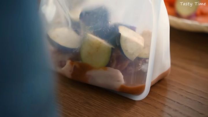 三つ目は、豚バラとナスの味噌炒めです。味噌にはちみつと酒を加えたタレを作り、豚バラやナスといっしょにチャックつきの保存袋へ入れます。調理する際は、凍ったままフライパンに移して水を大さじ1加えます。その後フタをして蒸し焼きにするだけなので、忙しい日のおかずとしてもおすすめです。