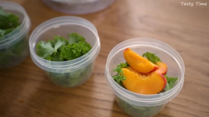 今回Tasty Timeさんは、先ほど紹介したカリーノケールといっしょにスムージーセットを作っていました。小さめの保存容器に、ちぎったカリーノケールと種を取ったネクタリンを入れて冷凍。飲むときは、凍ったままのスムージーセットをミキサーに移して水を加え、混ぜるだけ。カリーノケールは冷凍OKな品種なので、凍らせても新鮮なままなのが魅力です。ネクタリンのおかげで飲みやすいスムージーになりますよ。